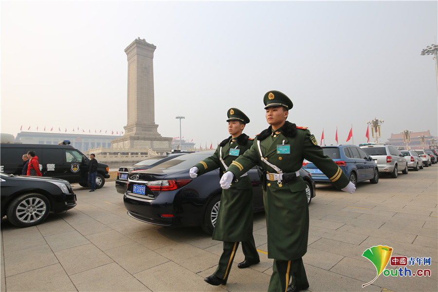 巡逻哨兵维护车场秩序。中国青年网通讯员 王炜 摄