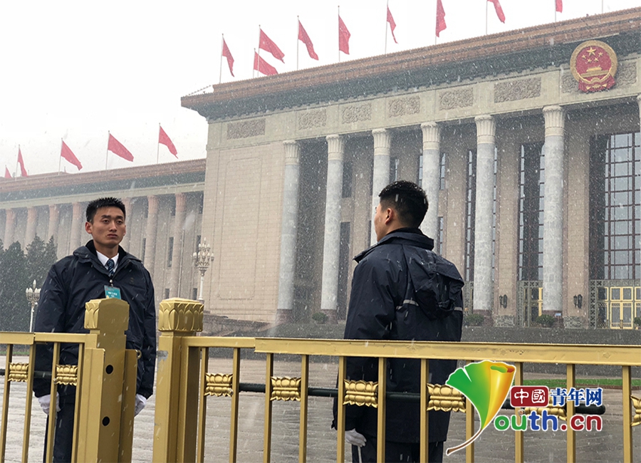 十三届全国人大一次会议第五次全体会后,工作人员在雪中执勤。中国青年网记者杨茜 摄