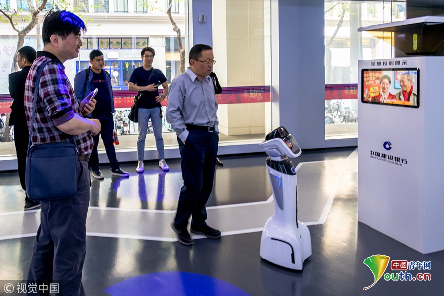 2018年4月11日,上海,国内首家“无人银行”近日在建行九江路支行开业,“无人银行”内两位智能机器人取代了银行柜员及工作人员,市民通过身份证实名认证即可入内办理各种业务。当天上午,不少市民来到黄浦区九江路303号的“无人银行”内体验这一全新的银行服务模式。