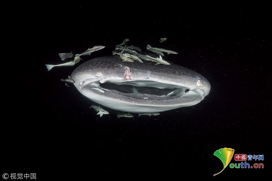 当地时间2018年3月,印度洋马尔代夫海域,当地海里的鲨和鱼。图为受伤鲸鲨张开“血盆大口”用嘴吸食浮游生物。来源:视觉中国