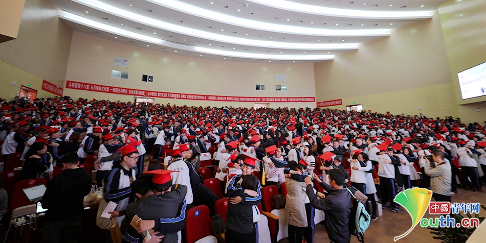 河北衡水第一中学2016级成人礼典礼现场,学生与其家长拥抱在一起。李广昊 摄