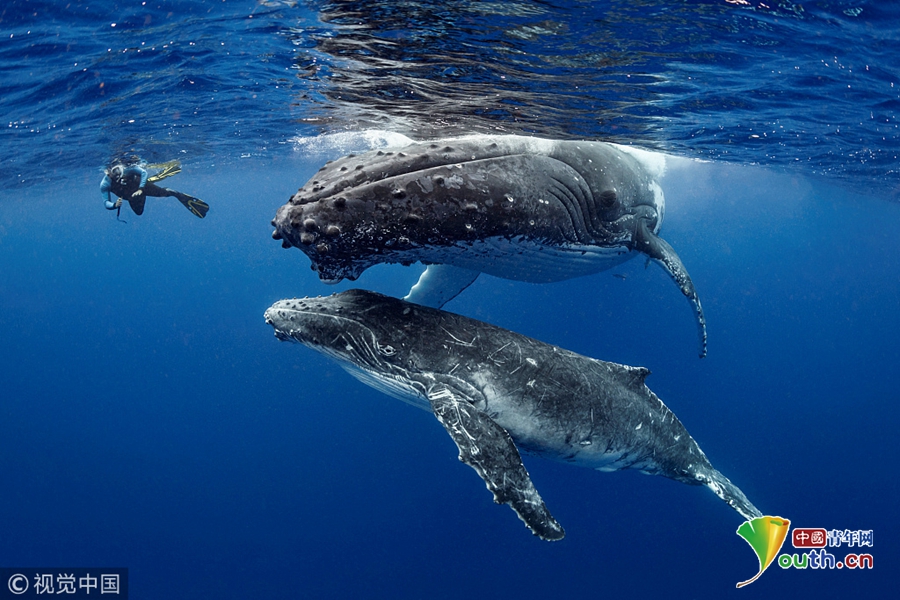 摄影师水下和座头鲸趣味同游 “好奇宝宝”甩尾互动超温顺