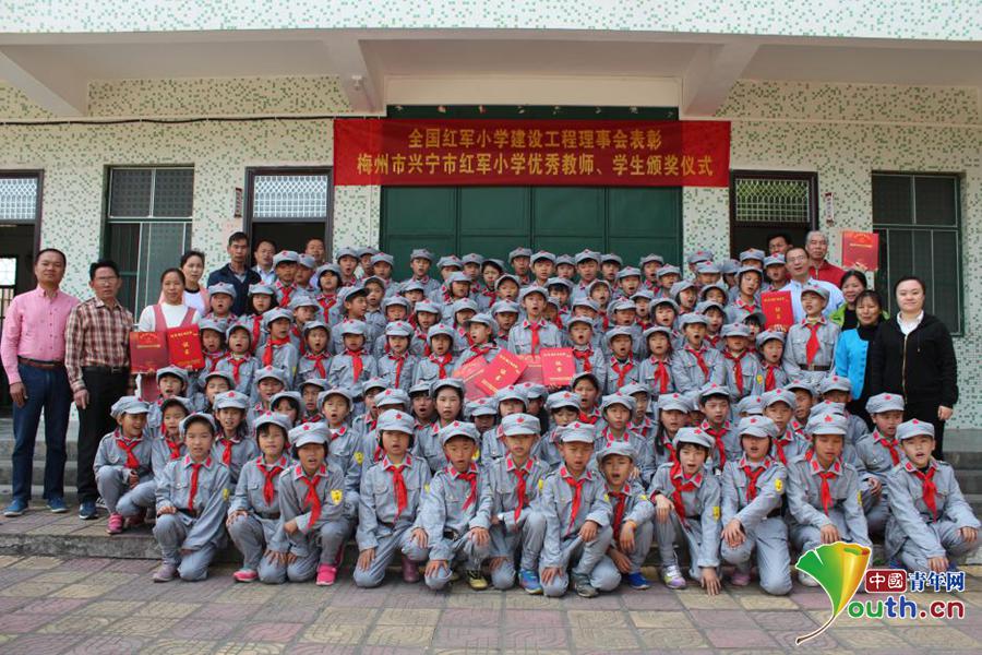 全国红军小学建设工程理事会相关负责同志代表理事会向广东梅州兴宁红军小学优秀教师、优秀少先队员颁发证书及奖品。中国青年网通讯员李厚绅 摄