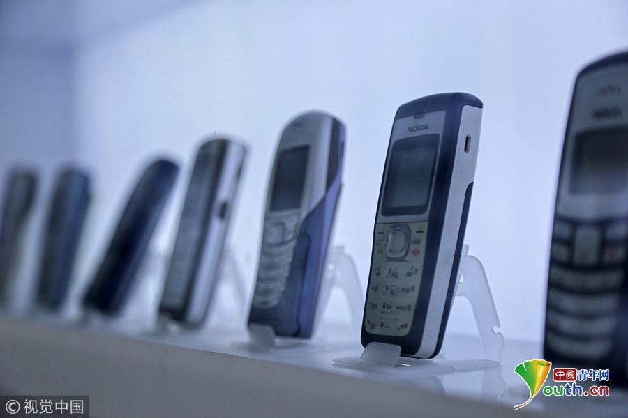 中国青年网北京4月18日电 4月17日,河南郑州,一商场设立了“手机博物馆”,32个展柜展出了不同时期的近500部手机,其中不乏有“大哥大”、传呼机、翻盖机等“古董机型”,还有上世纪90年代电信局颁发的“持机证”。