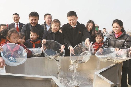 检察官与人大代表、政协委员以及在校学生进行增殖放流。