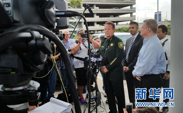1月6日,在美国佛罗里达州布劳沃德县劳德代尔堡-好莱坞机场,布劳沃德县官员斯科特·伊斯雷尔(中)就枪击事件向媒体讲话。美国东南部佛罗里达州劳德代尔堡-好莱坞机场6日发生枪击案,造成至少5人死亡、8人受伤。当地警方说枪手随航班降落,把手枪藏在已接受安检的托运行李中。新华社发
