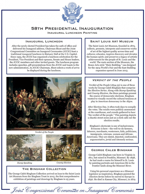 此前媒体报道的描述中,都暗示这幅画在就职程序中似乎承担了一个很重要的角色,比如圣路易斯公共电台的报道标题就为“宾厄姆《人民的选择》将成为特朗普就职典礼的瞩目焦点。”