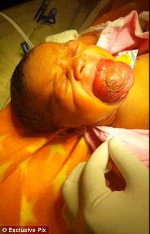 在印度中央邦的贾巴尔普尔,一个刚出生的小男孩Aparajit Lodhi患有罕见的巨舌症,舌头有李子那么大,并且随时都有可能窒息。