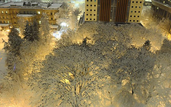 照片中,数百只乌鸦静静地栖息在大雪覆盖的树枝上。树下的路灯散发着昏黄温暖的灯光,灯光透过枝桠照在沉睡的乌鸦身上。如此美丽的冬季雪景加上可爱宁静的小乌鸦,仿佛仙境一般梦幻。