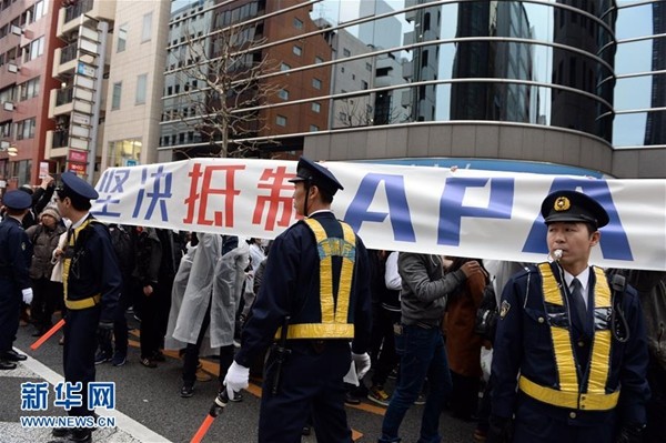 2月5日,在日本东京新宿,在日华侨华人手举标语走过APA酒店。 近百名在日华侨华人当日在东京举行了抗议APA酒店的和平游行活动。新华社记者马平摄