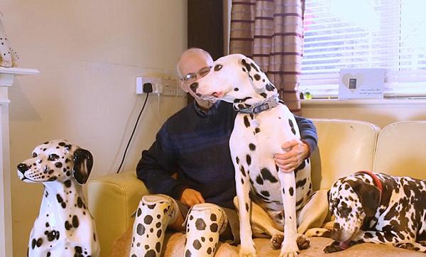【环球网综合报道】据英国《每日邮报》2月7日报道,英国男子戈登?桑德森(Gordon Sanderson)由于糖尿病引起的血液循环问题不得不进行腿部截肢,酷爱斑点狗的他选择装上与斑点狗毛色相似、黑白相间的假肢。