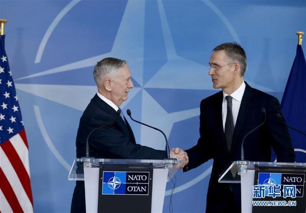 2月15日,在比利时布鲁塞尔北约总部,美国国防部长马蒂斯(左)和北约秘书长斯托尔滕贝格在联合记者会上握手。美国新任国防部长马蒂斯当日首次出席北约国防部长会议。 新华社记者叶平凡摄