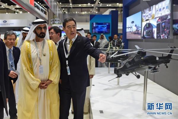 2月19日,在阿联酋首都阿布扎比,阿联酋副总统兼总理、迪拜酋长穆罕默德·本·拉希德·阿勒马克图姆(前左)参观中国防务展区。当日,第十三届阿布扎比国际防务展在阿联酋首都阿布扎比国家展览中心开幕。据介绍,本届防务展为期5天,共吸引了来自57个国家和地区的1200余家企业参展。新华社记者赵丁喆摄