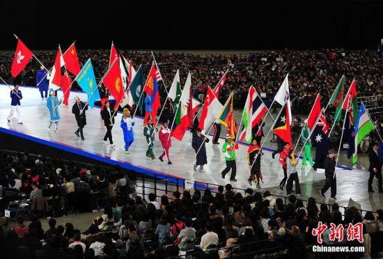 第八届亚洲冬季运动会2月19日在日本札幌市举行开幕仪式。本届亚冬会共有来自31个国家和地区代表团的约2000名运动员、教练员等参加,规模达到历届之最。图为开幕式。中新社记者 王健 摄