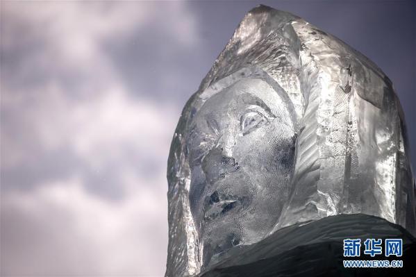 这是2月15日在莫斯科市马涅什广场拍摄的八米高冰雕塑像的头部。这座冰雕将成为即将在莫斯科拉开帷幕的俄罗斯谢肉节的标志物。 新华社/卫星社