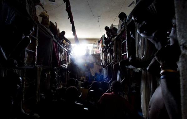 据英国《每日邮报》报道,近日,一组关于海地国家监狱的照片曝光,囚犯们在拥挤脏乱的国家监狱里生活,忍受着营养不良和传染病的折磨,恶劣的环境已经导致海地监狱里的囚犯死亡人数急剧上升,仅上个月就有21名囚犯死亡。图为囚犯们挤在阴暗狭小的牢房里看电视。电视是囚犯们自己凑钱买来的。