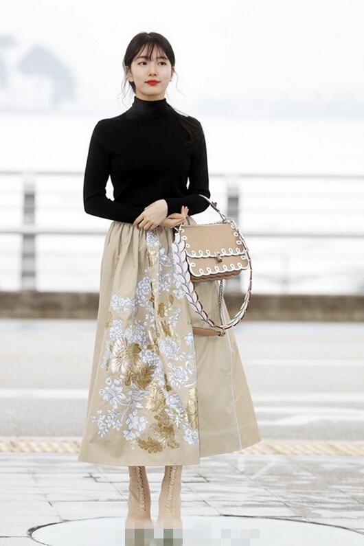 两位花旦同时亮相却演绎两款不同风格的春日时尚。郑秀晶身穿毛呢西装外套搭配黑色牛仔裤,再次展现了“冰山女王”的干练高冷。秀智则身穿黑色针织衫和长款印花A字裙现身,一如既往的清纯又华丽。
