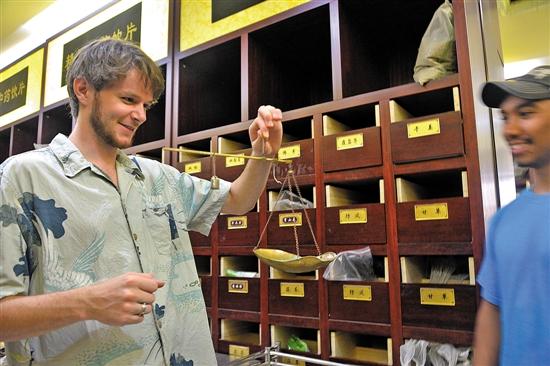 一些到中国进修的国外留学生就算不是学中医,也对中医表现出浓厚的兴趣。通过了解中医中药知识、参观我国传统中医医疗器械展览、体验感受中医传统特色疗法,他们甚至有些人还由此改变了人生方向。图中一位外国学生正在学习称中药。