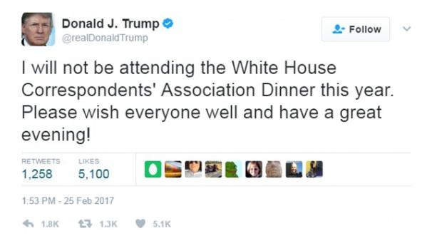 特朗普曾于2011年参加了白宫记者晚宴,并被当时仍是总统的奥巴马调侃。2016年的竞选期间,尽管奥巴马发出了邀请,特朗普同样缺席了晚宴。奥巴马称:“特朗普没来我感觉有些不快,特朗普拒绝了一屋子的记者和名流,这不正常。”