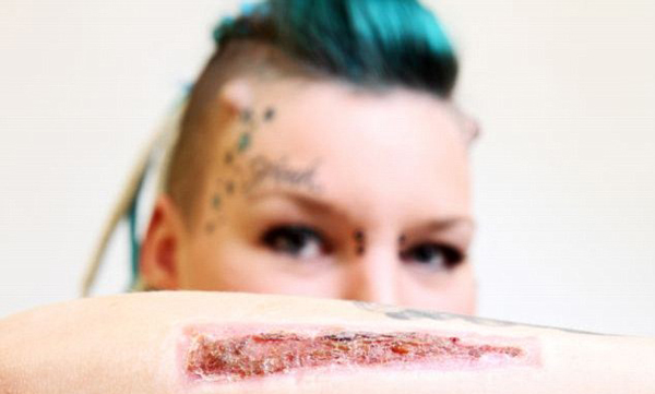 【环球网综合报道】据英国《每日邮报》2月23日报道,近日,来自英国埃塞克斯郡的30岁女子托茨?雷诺兹(Torz Reynolds)继2014年因遭男友背叛割下刻有前男友名字的纹身寄给前男友后,现在又出“怪招”——用断线钳切下小拇指,并称“我愿意”,“这样看起来会好看些”。