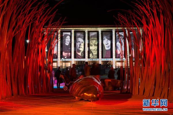 这是3月3日在澳大利亚堪培拉灯光秀上拍摄的被彩灯点亮的国家图书馆。当日,一年一度的堪培拉灯光秀在堪培拉国会区正式“点亮”。夜幕降临,炫目的灯光秀为澳大利亚国家艺术馆、国家图书馆、国家科技馆和议会大厦等标志性建筑披上了霓裳。新华社发(吴颐良摄)