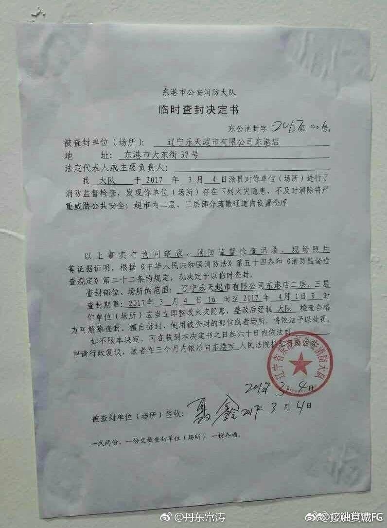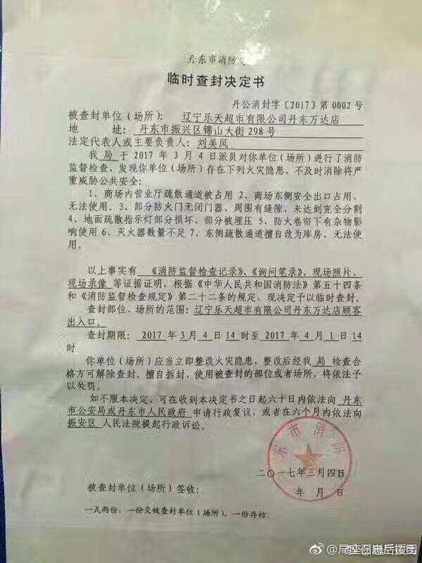 3月6日,因消防问题,安宿州市埇桥区公安消防大队向江苏乐天玛特商业有限公司宿州店下达临时查封决定书,为期一个月。