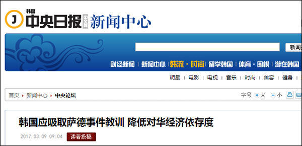 此外,3月9日上午,韩国中央日报发表评论称,韩国应吸取萨德事件教训,降低对华经济依存度。