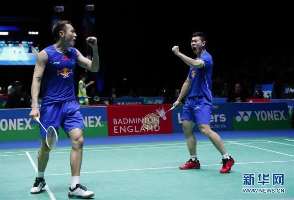 3月10日,张楠(左)/刘成在获胜后庆祝。当日,在英国伯明翰进行的2017全英羽毛球公开赛男双四分之一决赛中,中国组合张楠/刘成以2比1战胜日本组合嘉村健士/园田启悟,晋级四强。新华社记者 韩岩 摄
