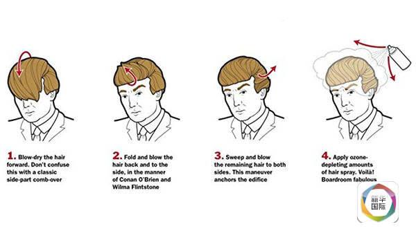前端两侧留长,以不同方向往后梳齐固定。最特别的是顶上留长,梳向额头,再180度大转弯梳向顶端。