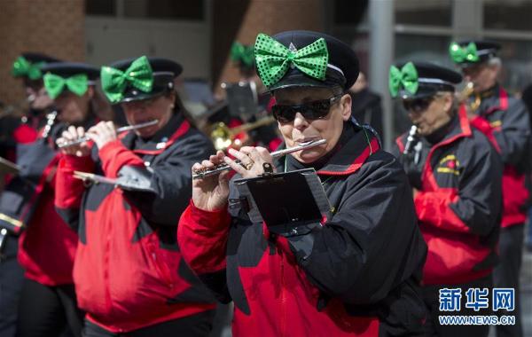 3月19日,在加拿大多伦多,一支乐队在游行活动中表演。当日,加拿大多伦多举行2017年圣帕特里克节游行,吸引成千上万市民身着绿色服饰沿途观看。每年3月17日的圣帕特里克节是爱尔兰传统节日,为纪念爱尔兰守护神圣帕特里克而设立。新华社发(邹峥摄)