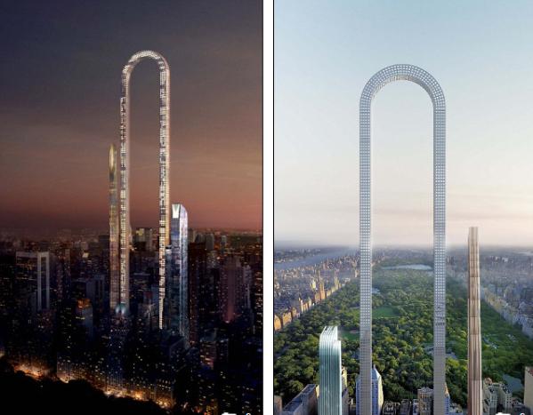 “大弯塔”是一座纤细的塔式建筑,呈倒U形,最高处呈圆弧,像一枚回形针。建成后,它将成为“世界上最长的建筑”,曼哈顿的天际线将会被它改变。
