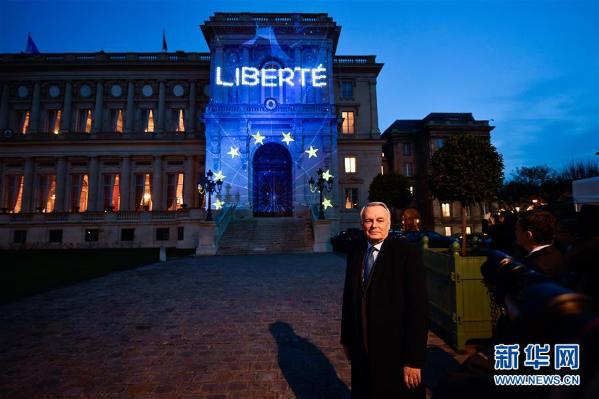 3月24日,在法国巴黎,法国外长艾罗出席亮灯仪式。 当日,法国外交部在外交部大楼外墙上用灯光投影的方式纪念《罗马条约》签署60周年。新华社记者陈益宸摄