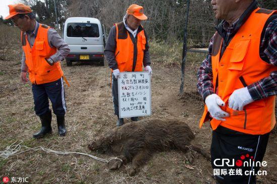 当地时间2017年3月30日,日本福岛,解封后的福岛核辐射重污染区内,日本相关防控部门猎杀放射变异野猪。由于这些野猪生活在放射性沾染区且吃着带有放射性的食物,所以它们自身也开始带有放射性,而这意味着它们的肉无法拿来食用。