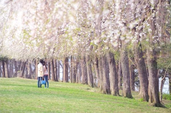 在南怡岛从中央红松路往东走,沿着江边会有一排排樱花树映入眼帘。低垂的树杈上开满了雪白的樱花,一眼望去很是壮观。很多情侣会选择在此拍摄婚纱照,留下难忘的美好回忆。不仅如此,游客还可以在宽阔的草地上边骑自行车,边享受春天的美景。