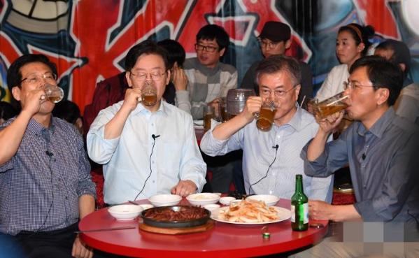 人民网4月10日讯 当地时间8日下午,韩国最大在野党共同民主党总统候选人文在寅在首尔麻浦区的一家酒吧,与此前党内预选阶段的其他三位竞争对手忠清南道道知事安熙正、城南市市长李在明和高阳市市长崔星一起举杯畅饮。