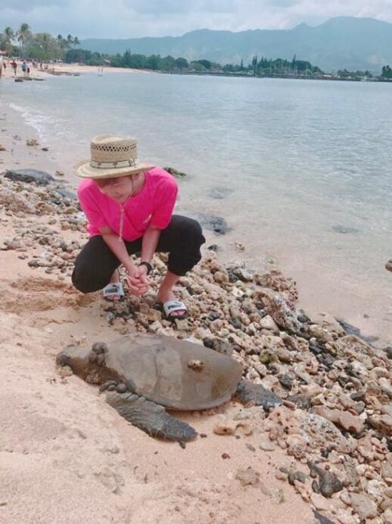 照片中,金南俊蹲在海龟旁边,逗海龟的样子十分有爱。而金硕珍和朴智旻则化身文艺男孩,坐在海边静静地注视海龟。网友纷纷表示“硕珍和智旻天天腻在一起,越来越像了”,“海龟啊,你能看到哥哥们真好”等等。
