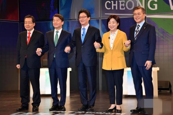 韩国五大政党总统候选人洪准杓(自由韩国党)、安哲秀(国民之党)、刘承旼(正党)、沈相奵(正义党)和文在寅(共同民主党)共同参加首场电视辩论。