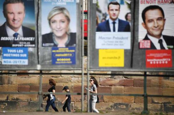 2017年4月10日,在法国斯特拉斯堡,人们走过总统竞选宣传海报。(新华社/法新)