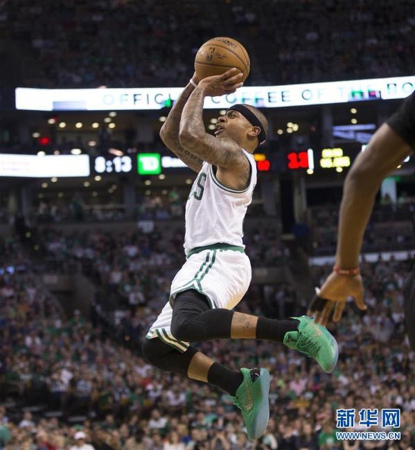 4月16日,波士顿凯尔特人队球员托马斯投篮。当日,在2016-2017NBA季后赛东部首轮比赛中,芝加哥公牛队客场106比102战胜波士顿凯尔特人队。 新华社/欧新