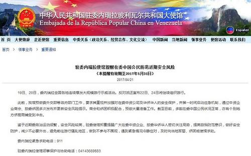 鉴于近期委内瑞拉安全风险较高,驻委使馆郑重提醒广大在委中资企业、旅委华侨华人密切关注局势,提高自我防范意识,做好安全防护,减少不必要外出,避免前往游行骚乱地区,做到不参与不围观,遇到紧急情况冷静应对,及时向当地军警、侨团或使馆求助。
