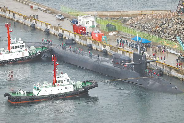 25日朝鲜建军节之际,美国“密歇根”号核动力潜艇抵达韩国釜山港。
