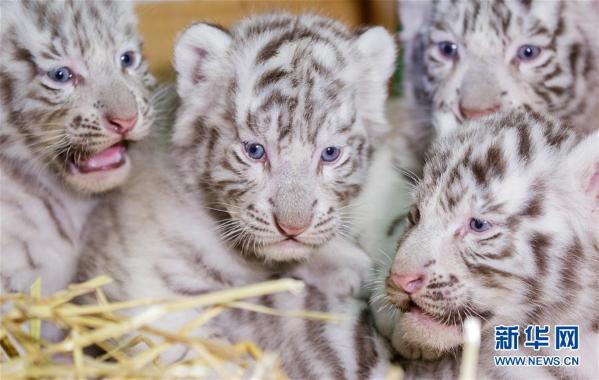 这是4月26日在奥地利凯恩霍夫的白色动物园拍摄的孟加拉白虎四胞胎。孟加拉白虎四胞胎今年3月22日出生在白色动物园。两只雄虎叫法尔科和托托,雌虎的名字则是米娅和毛特兹。 新华社/欧新