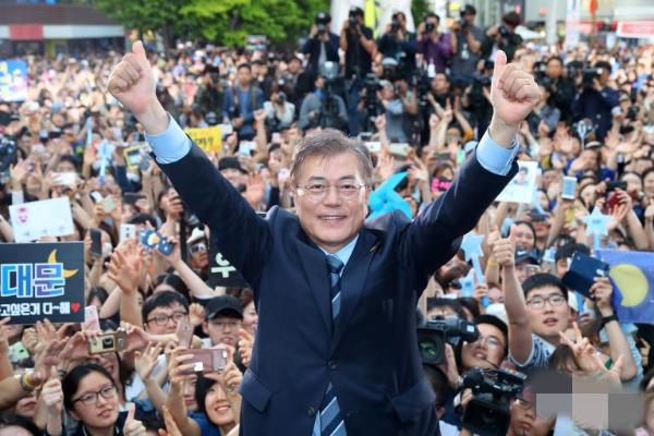 5月1日下午,共同民主党总统候选人文在寅现身京畿道议政府市青年之街,开展街头拉票活动。