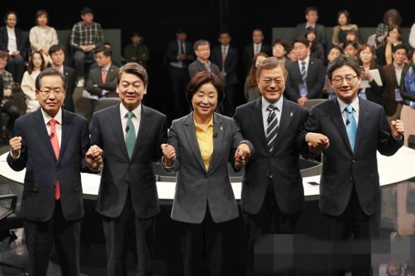 从左至右依次为自由韩国党总统候选人洪准杓、国民之党候选人安哲秀、正义党候选人沈相奵、共同民主党候选人文在寅和正党候选人刘承旼。