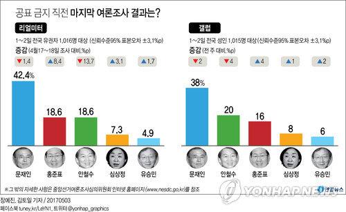 据悉,上述结果是本次大选之前可进行公布的最后一次民调结果。据韩国公职选举法有关规定,任何机构和个人都不得公布大选开始前一周之内的民调结果。