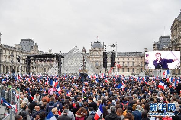 5月7日,在法国巴黎卢浮宫,人们庆祝“前进”运动候选人埃马纽埃尔·马克龙胜选。法国多家民调机构7日晚公布的预测结果显示,“前进”运动候选人埃马纽埃尔·马克龙在2017年法国总统选举第二轮投票中获得超过65%的选票,领先极右翼政党“国民阵线”候选人玛丽娜·勒庞,当选法兰西第五共和国第8位总统。新华社记者陈益宸摄