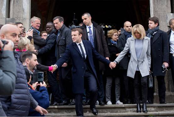 【环球网综合报道】法国中间派总统候选人马克龙在当地时间5月7日大选中胜出晋升为法国最年轻总统。从选举时开始,马克龙与比自己大24岁的妻子就早已成为媒体热门报道对象。英国一名肢体语言专家日前接受英国《快报》的采访,并通过一些照片对两人关系以及照片背后的人物心理进行了解读。 马克龙的妻子布丽吉特?特罗尼厄今年已经64岁了,足足比他大24岁。二人在马克龙上高中的时候相识。在当时,布丽吉特?特罗尼厄是马克龙的老师。在2007年,二人结为夫妻。 英国《快报》5月7日刊登了四张马克龙夫妇的照片,并邀请肢体语言专家达伦?斯坦顿对这几张图片一一解读。