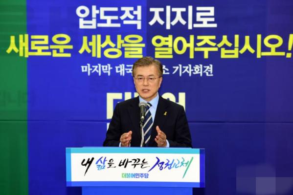 韩联社5月8日报道称,民调支持率居首的最大在野党共同民主党候选人文在寅于当天上午在首尔召开记者会,呼吁选民支持。随后前往釜山,釜山位于首尔东南方向约450公里处,被视为保守派大本营,对文在寅来说也是摇摆选民最集中的地区。离开釜山后,文在寅前往另一主要“敌营”大邱,而后转战忠清北道城市清州。