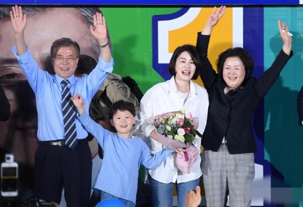 8日下午,文在寅在首尔光化门广场做最后的竞选拉票。其夫人金正淑(音,右一)和女儿文多慧(音)及孙子现身支持。