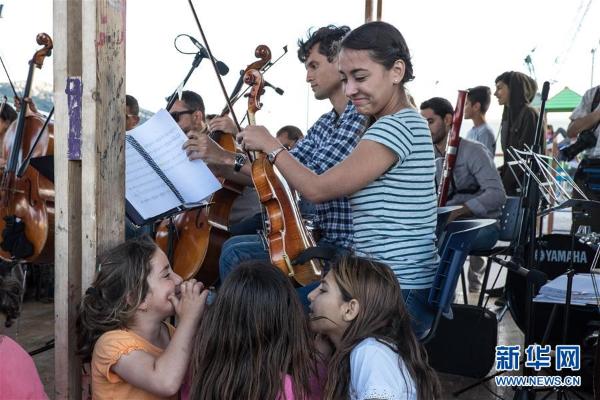 5月10日,在希腊比雷埃夫斯附近的斯卡拉马加斯难民营,小难民围坐在委内瑞拉加拉加斯市政青年交响乐团的乐手旁聆听音乐。当日,委内瑞拉加拉加斯市政青年交响乐团来到斯卡拉马加斯难民营,为难民举行了一场特别的音乐会。斯卡拉马加斯本是一处废弃的工业园区,希腊政府将这里的410个集装箱改造成房屋,供约3500名难民栖身。这些主要来自叙利亚、伊拉克、阿富汗等国家的难民,是从巴尔干半岛前往中欧的通道被关闭后被迫滞留在希腊的约6.2万名难民中的一部分。新华社发(莱夫特里斯·帕察里斯摄)